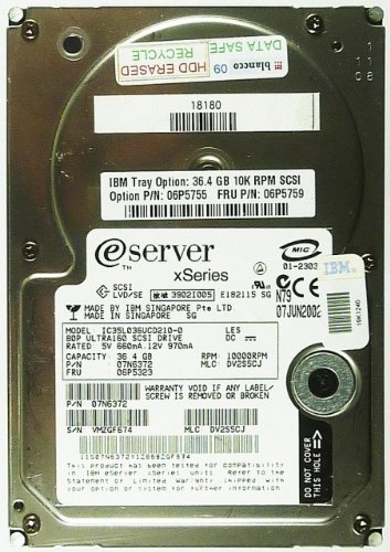 36,4GB Festplatte IBM xSeries 'IC35L036UCD210-0' Ultra160 80-polig SCSI, 8,9cm (3,5')Anschluss 80-polig SCA. 10000RPM. Option P/N: 06P5755. FRU P/N: 06P5759 Die Festplatte ist in tadellosem Zustand und wird unformatiert geliefert.